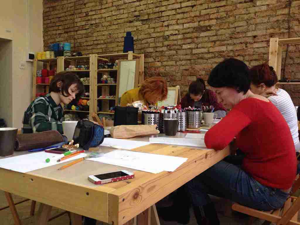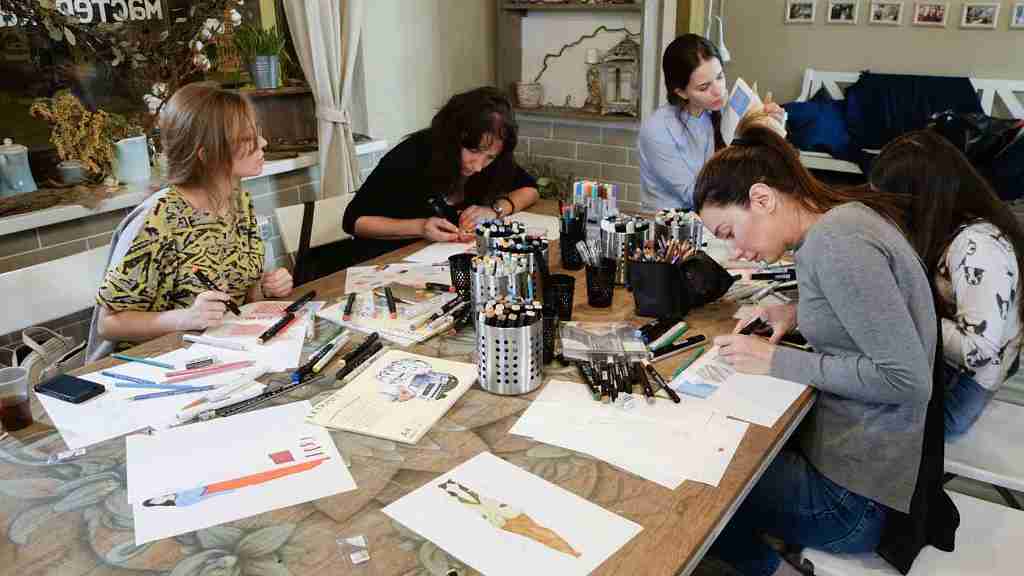 Двухдневный мастер-класс по модельерскому скетчингу. Отрабатывали пропорции лица и тела, текстуры, модные образы. Место проведения — уютная студия вязания Манефа.